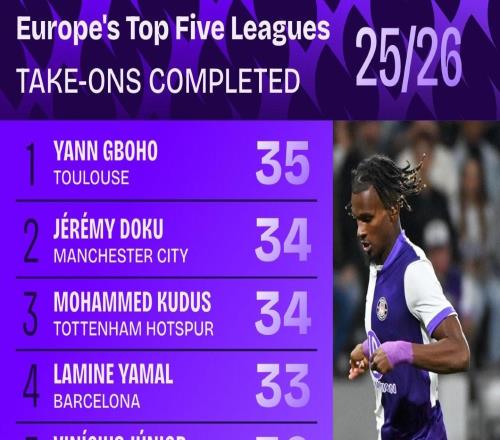 根据统计,本赛季到目前为止,亚马尔是欧洲五大联赛当中成功过人次数最多的球员,库杜斯位居第二,姆巴佩位居第三。...