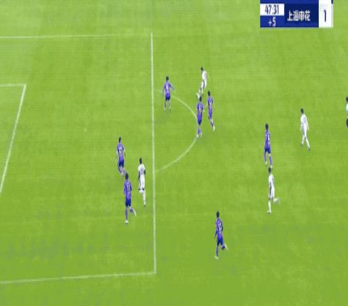 上半场补时阶段,高天意面对三人防守完成过人,之后的射门被挡出了底线。