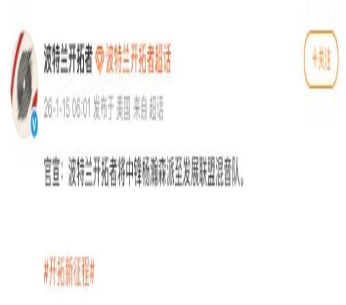 波特兰开拓者将杨瀚森派至发展联盟混音队 界面新闻 2026-01-15 10:10:45 1月15日,@波特兰开拓者 宣布,将中锋杨瀚森派至发展联盟混音队。NBA免费观看_杨瀚森免费观看_混音队免费观看_NBA高清在线_杨瀚森高清在线_混音队高清在线 NBA 杨瀚森 混音队 波特兰开拓者 上一篇: 湖人又签下一位“科比”巴夫金获雷迪克盛赞的防守到底咋样 下一篇: 曝篮网希望在小波特交易中得到勇士26&28年的两个首轮签